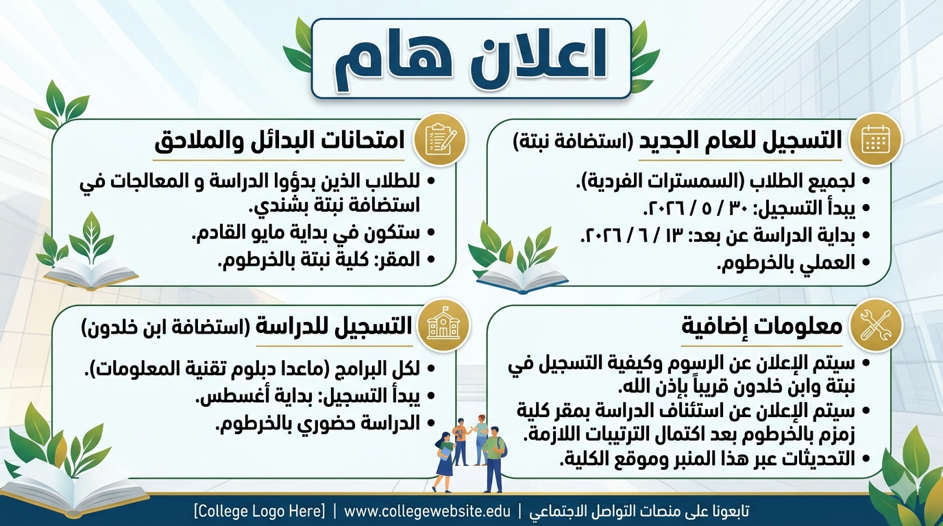 main story news feed Slide اعلان هام – للطلاب الذين بدؤوا الدراسة والمعالجات في استضافة نبتة بشندي – كلية نبتة بالخرطو م admin Post navigation Previous: التسجيل الالكتروني للطلبة الجدد المرشحين للقبول بكلية زمزم الجامعية العام ٢٠٢٦/٢٠٢٥ More Stories main story التسجيل الالكتروني للطلبة الجدد المرشحين للقبول بكلية زمزم الجامعية العام ٢٠٢٦/٢٠٢٥ admin main story news feed Zamzam University College of Medicine Program has been approved by the General Medical Council (GMC) in the United Kingdom for registration requirements.. admin main story أعلان هام admin